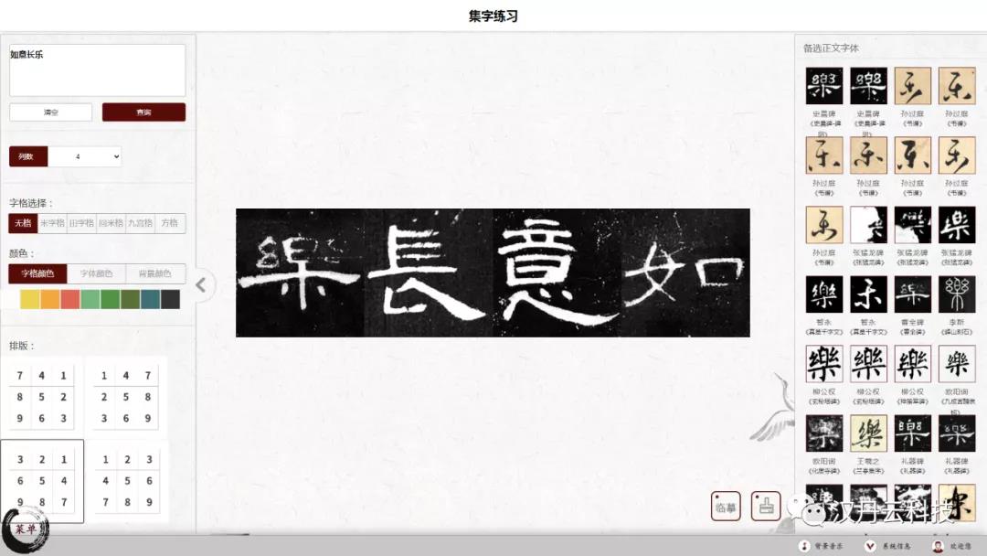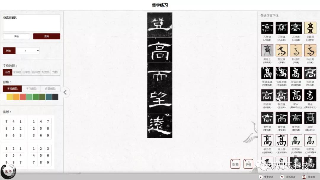 漢丹云智慧書(shū)法教室軟件能夠根據(jù)用戶需求,任意選調(diào)《曹全碑》中的例字,并將其按照需要的版式,1-16字選擇排版,當(dāng)場(chǎng)形成書(shū)寫(xiě)字帖,在桌面電腦上可觀賞可臨寫(xiě)可描摹十分方便!