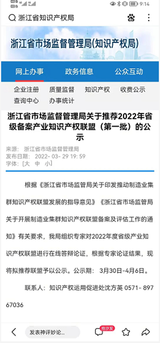 浙江省市場監督管理局關于推薦2022年省級備案產業知識產權聯盟(第一批)的公示
