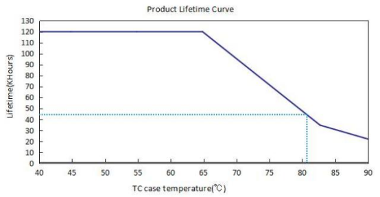 質保說明“5年(Tc ≤80.5℃)”,表示該產品5年壽命質保是在Tc ≤80.5℃的條件下,具體不同應用溫度下的壽命情況還可參照規格書中壽命曲線查看。