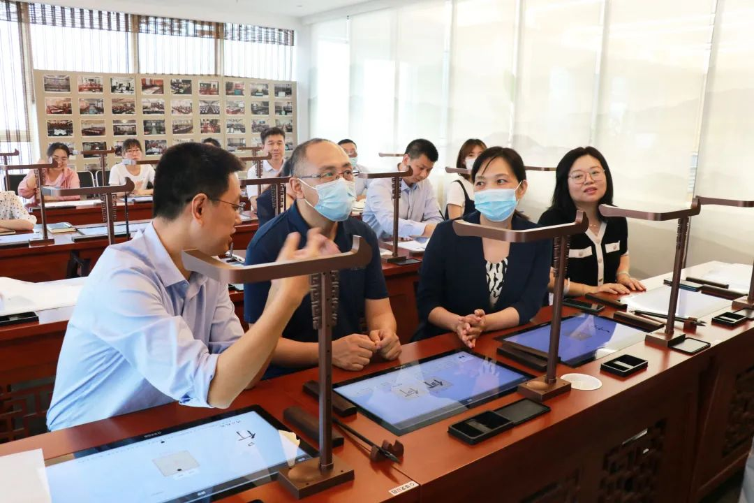 會前,在華文眾合第八代智慧書法教室里,張曉晟一行認真聽取了華文眾合的企業發展成果介紹,仔細了解交互式數字臨摹臺以及多維互動系統的各項應用功能。