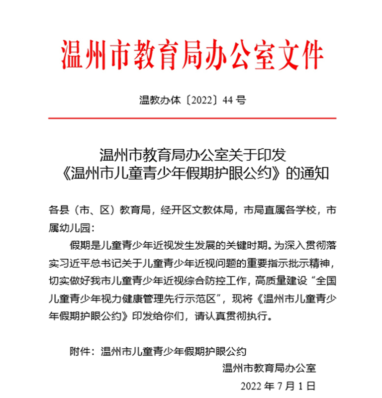 2022年7月1日,溫州市教育局發(fā)布《溫州市兒童青少年假期護(hù)眼公約》,強(qiáng)調(diào)假期是兒童青少年近視發(fā)展的關(guān)鍵時(shí)期,要求全市兒童青少年在暑假學(xué)習(xí)娛樂中,堅(jiān)持愛眼、護(hù)眼,度過一個(gè)輕松、充實(shí)、有意義的假期。