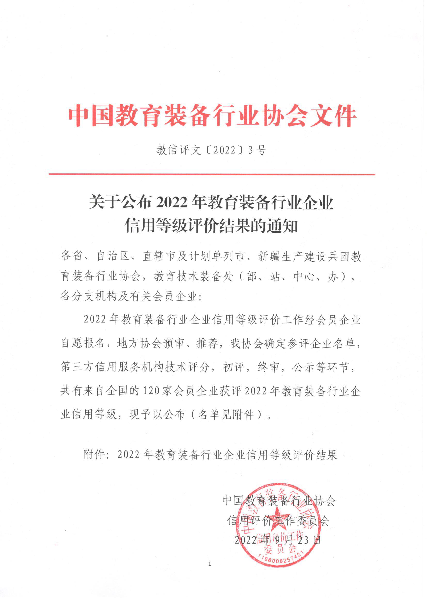 關(guān)于公布2022年教育裝備行業(yè)企業(yè)信用等級(jí)評(píng)價(jià)結(jié)果的通知