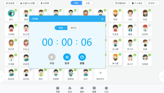 電子黑板配套的歐帝成長腳印可以設置隨機抽取學生提問,調動課堂積極性、營造學生緊張感、使注意力更集中。在課堂中引入課堂競賽、限時練習等方式活躍課堂氛圍。師生可以清晰地看到倒計時和秒表的醒目數字,增加課堂節奏感。