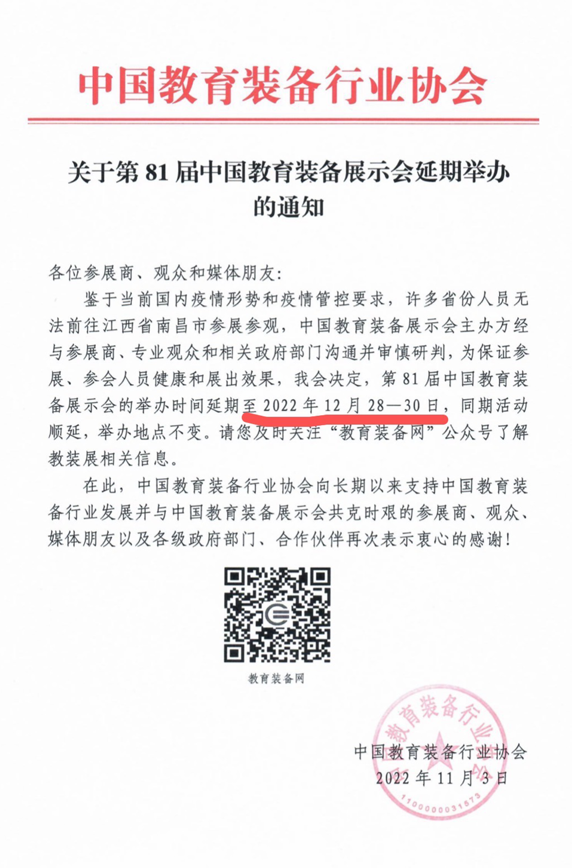 受疫情影響,昨日中教協(xié)發(fā)函通知,原定于2022年11月18-20日舉辦的第81屆中國(guó)教育裝備展示會(huì),延期至2022年12月28-30日!由此給您造成的不便,我們也深感抱歉,期待與您再次相約!