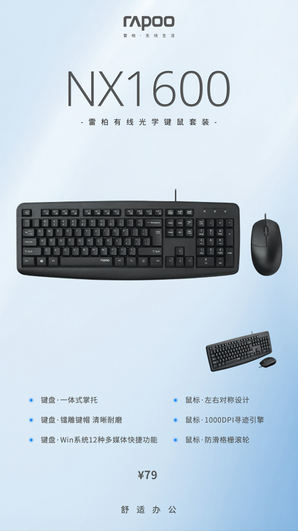 雷柏NX1600有線光學鍵鼠套裝用一份舒適&實用+性價比為設計語言助力辦公人群,官方指導價79元,現已上市!