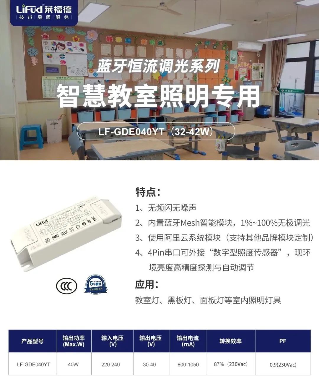 除常規及Zigbee智慧教室方案,2022年萊福德再次針對教室照明推出藍牙方案電源,該系列使用阿里云系統模塊,可直接接入阿里云平臺,實現1%~100%無極調光,(PS:該系列支持定制其他品牌藍牙Mesh模塊)。