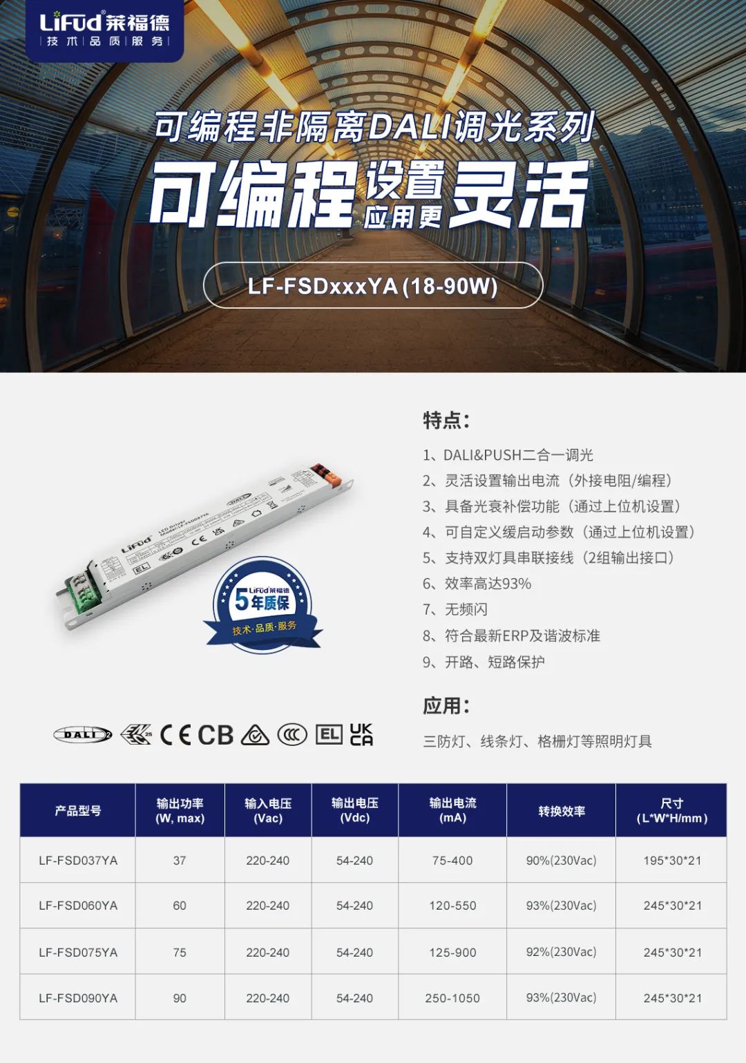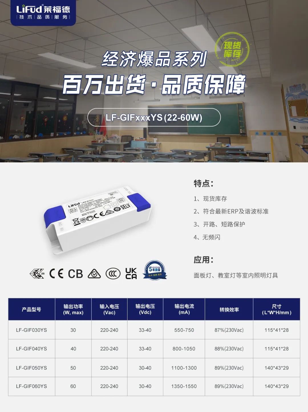 該系列為萊福德經典歐規面板燈電源,此次升級不僅優化性能使產品滿足最新ERP及諧波標準,更應市場需求,擴充了60W功率段,為更多應用場景需求提供選擇。