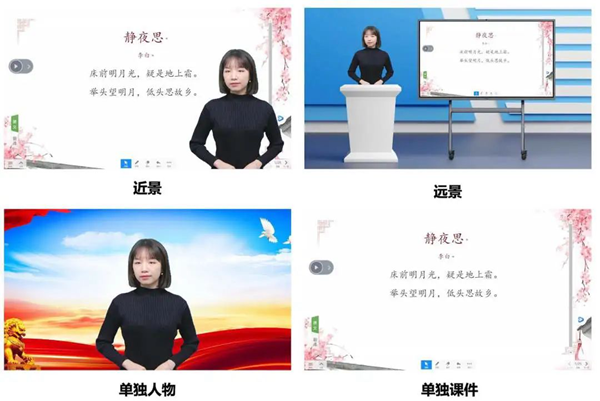 針對(duì)多樣化授課需求,錄制過程中老師可對(duì)拍攝布局進(jìn)行切換。智能摳像系統(tǒng)預(yù)先設(shè)置多種拍攝布局,人物遠(yuǎn)景、人物近景、單獨(dú)課件等可根據(jù)需求自由切換。同時(shí)系統(tǒng)支持對(duì)前景人物、課件的大小、位置進(jìn)行調(diào)節(jié)。