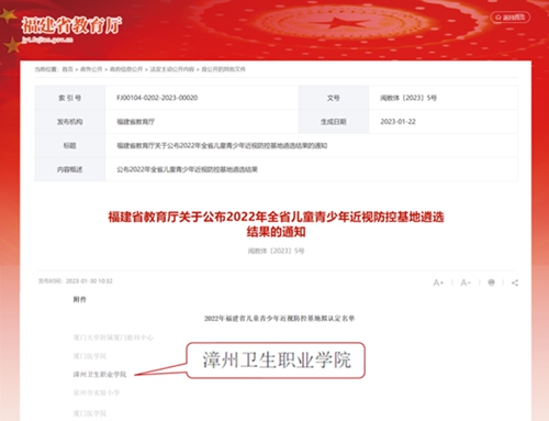 近日,福建省教育廳公布了2022年福建省兒童青少年近視防控基地遴選結(jié)果,全省共有23家單位獲評,其中漳州衛(wèi)生職業(yè)學(xué)院是漳州市唯一一家入選的單位,備受矚目!