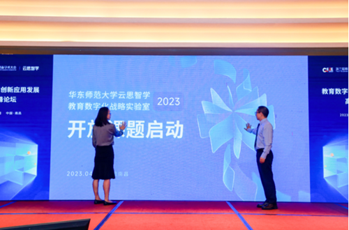 在本次高峰論壇上,為了鼓勵更多的區域、學校在學術引領、研究實證的基礎上科學推進教育數字化轉型,“華東師范大學云思智學教育數字化戰略實驗室”面向一線教育教研者設立課題基金項目,為人工智能教育研究聯盟學校和區域提供課題基金申請平臺。顧小清教授發布2023年實驗室開放課題重點研究領域以及年度開放性課題申報指南,并與云思智學CEO劉渝一同開啟2023年實驗室開放課題申報。