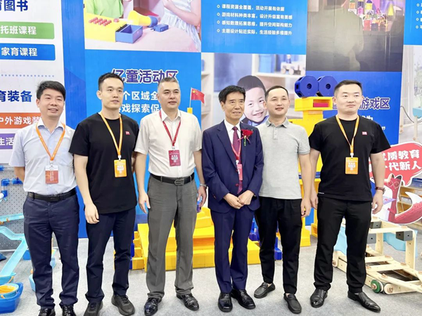 ▲ 教育部關心下一代工作委員會常務副主任、中國教育裝備行業協會專家委員會主任王富(右三)一行到億童展位參觀指導