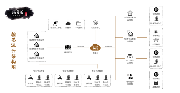 翰墨派投射式云書法教室是專門針對書法教學研發的新一代全方位數字書法輔助教學設備,系統采用云體系架構,解決高校實際教學使用中的場景問題。