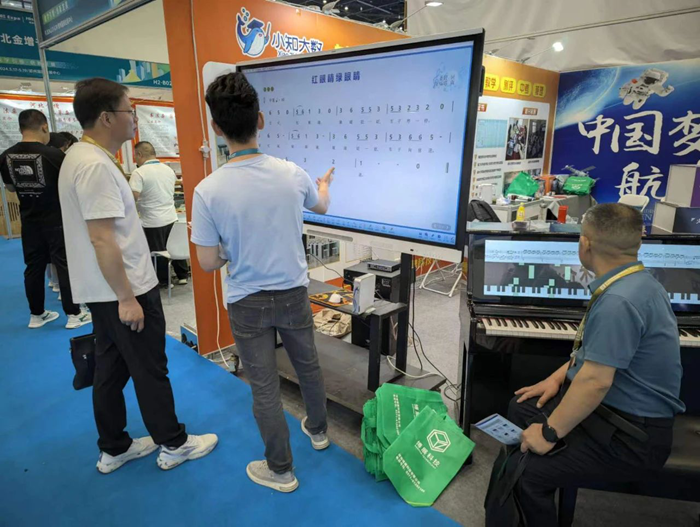 展會現場,工作人員熱情地接待了來訪的嘉賓,詳細介紹了小知大數智慧音樂教室、智慧美術教室、藝術素質測評方案、美育考試測評方案等優勢產品。