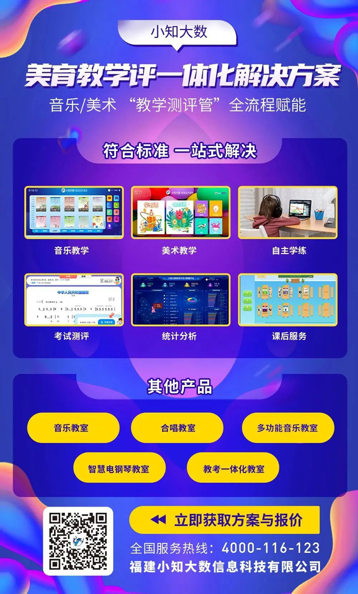 小知大數攜“小知大數學校美育數字化整體解決方案”參與展會,方案包含音樂美術教學,測評、管理、課后服務一體化,滿足《中小學生藝術素質測評辦法》等要求。