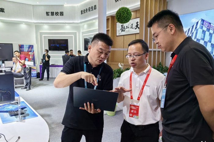 在新華三和紫光計算機的聯合展廳中,全方位、場景式的展出了臺式機、筆記本、顯示器、桌面生態配件、操作系統、解決方案等適配教育場景的全棧產品,吸引眾多觀眾駐足展廳詳細了解、親身體驗。