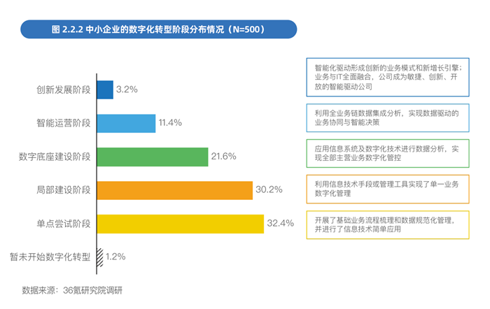 《報告》數據顯示,絕大多數中小企業(占比98.8%)已經開啟數字化轉型,僅有極少數中小企業(1.2%)尚未開始。其中,處于數字化早期的中小企業占比62.6%,數字化水平較高、由智能驅動的中小企業占比僅為3.2%。