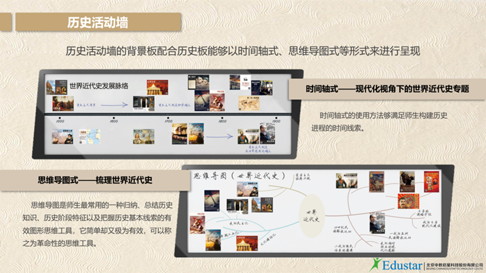歷史活動墻是一款可以自由變化的“時間軸”類歷史教學(xué)產(chǎn)品,配有180塊歷史板。歷史板是以圖像、文字的形式呈現(xiàn)某一歷史人物、歷史事件和歷史現(xiàn)象,可自由粘貼在背景版上。教師可借助歷史活動墻,引導(dǎo)學(xué)生學(xué)習(xí)中國和世界歷史上的重要歷史事件、重要歷史現(xiàn)象和重要歷史人物,掌握歷史發(fā)展的線索和脈絡(luò)。