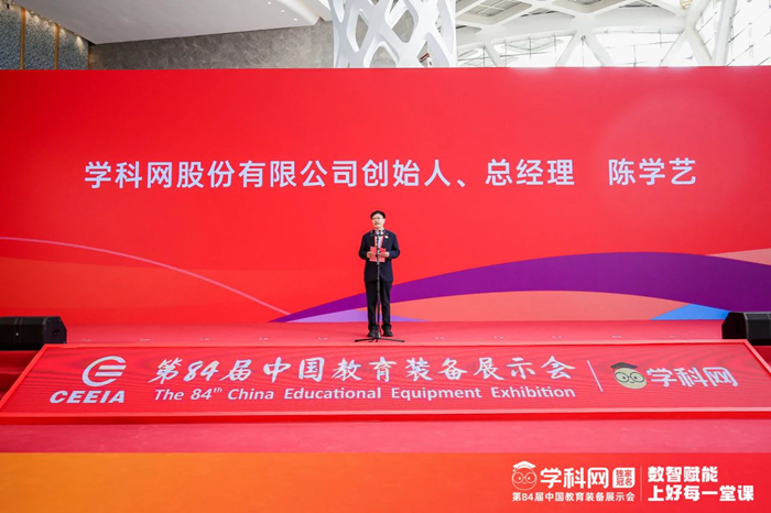 ▲在開(kāi)幕式上,學(xué)科網(wǎng)創(chuàng)始人、總經(jīng)理陳學(xué)藝作為參展商代表致辭