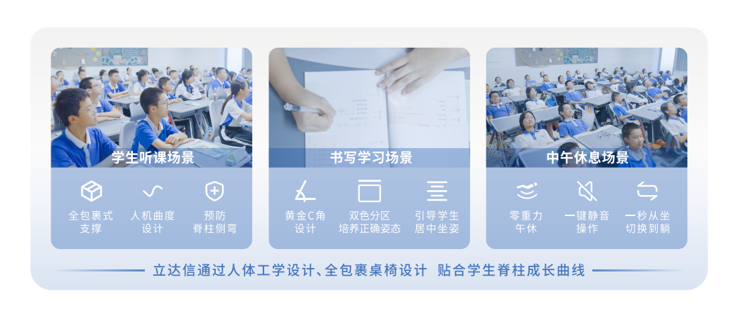 立達(dá)信護(hù)脊健康課桌椅通過人體工學(xué)設(shè)計(jì),全包裹桌椅設(shè)計(jì),貼合學(xué)生脊柱成長曲線。針對(duì)學(xué)生聽課場景,通過靠背、坐墊的人機(jī)曲度設(shè)計(jì),舒緩脊柱壓力,靠背的全包裹式支撐,輔助維持坐姿中正平衡,預(yù)防脊柱側(cè)彎;針對(duì)書寫學(xué)習(xí)場景,桌面的黃金C角設(shè)計(jì)可以很好的引導(dǎo)學(xué)生居中坐姿,肘部弧度支撐緩解書寫疲勞,雙色分區(qū)設(shè)計(jì),讓孩子養(yǎng)成正確的學(xué)習(xí)姿態(tài),護(hù)眼又護(hù)脊;針對(duì)中午休息場景,護(hù)脊課桌椅可一鍵靜音操作,1秒從坐切換到躺,坐墊同時(shí)后仰一定角度,防止身體下滑,即使午睡也能保持好姿態(tài),頭枕和腿托也可根據(jù)身高調(diào)節(jié),舒適方便。