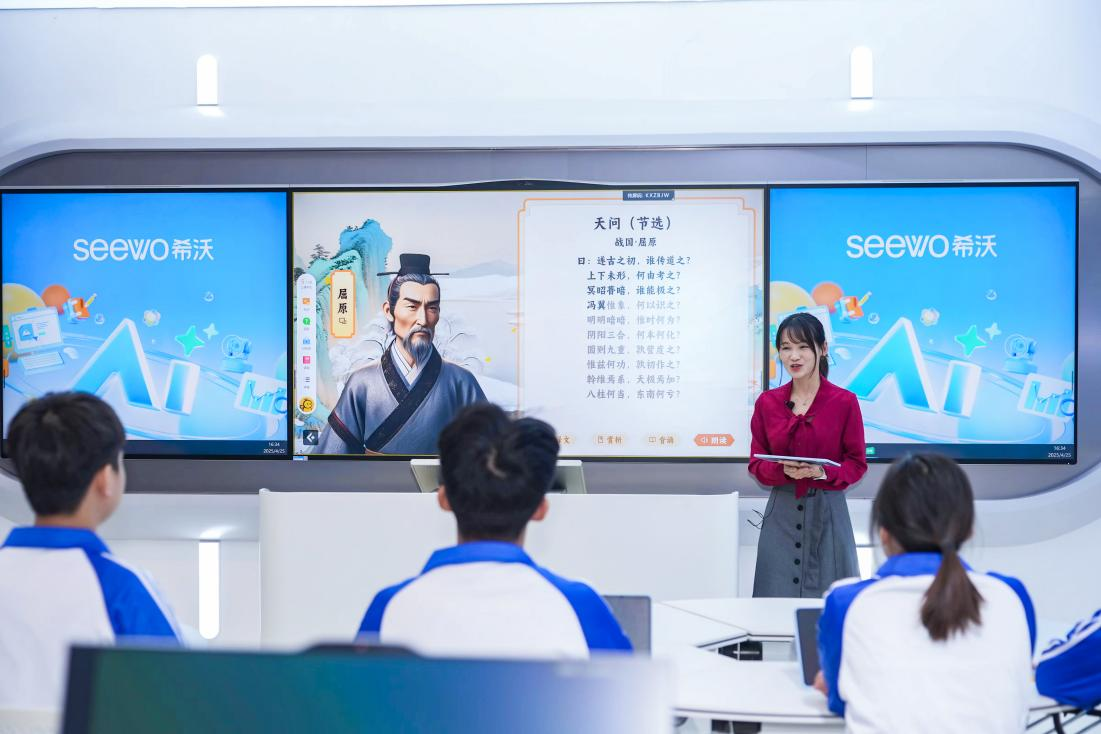 這是希沃AI教學(xué)空間方案,其搭載希沃AI核心技術(shù),以“師生減負(fù)提效”為起點(diǎn)、以“助力教學(xué)相長(zhǎng)”為目標(biāo),為教學(xué)設(shè)計(jì)、實(shí)施、評(píng)價(jià)全流程帶來(lái)全面提升。