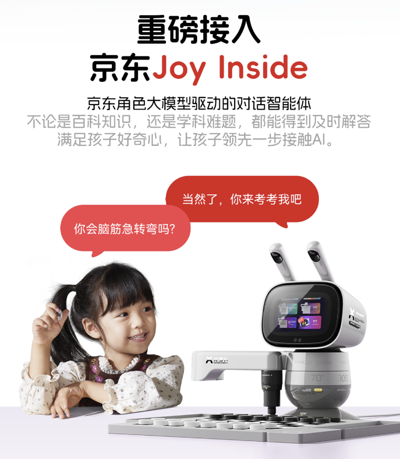 作為家用下棋機器人的開創者,元蘿卜憑借將AI下棋和益智教育融為一體的創新體驗,迅速成為“智能機器人”品類的佼佼者。Joy Inside作為京東旗下大模型附身智能品牌,其加入為機器人注入有趣的靈魂。