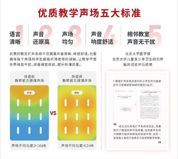 立達(dá)信在與學(xué)校多年的緊密配合中,通過(guò)深入走訪調(diào)研,了解學(xué)校教室對(duì)好聲音的需求,總結(jié)出優(yōu)質(zhì)教學(xué)聲音的五個(gè)標(biāo)準(zhǔn):語(yǔ)言清晰、聲音還原度高、聲場(chǎng)均勻、聲音響度舒適、相鄰教室聲音無(wú)干擾。