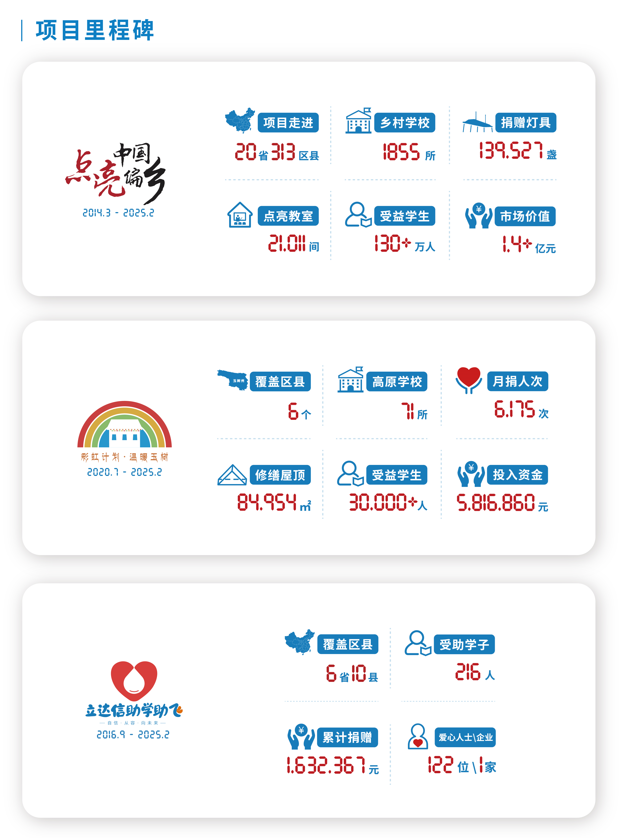 基金會(huì)品牌項(xiàng)目“點(diǎn)亮中國(guó)偏鄉(xiāng)”為全國(guó)首個(gè)專注于鄉(xiāng)村學(xué)校照明改善的公益項(xiàng)目。該項(xiàng)目以立達(dá)信之所長(zhǎng)——照明,無(wú)償捐贈(zèng)護(hù)眼燈具,改善廣大中國(guó)偏鄉(xiāng)學(xué)校落后的教室照明。該項(xiàng)目先后獲得新浪教育“2018年度教育公益杰出項(xiàng)目”、國(guó)務(wù)院原扶貧辦“2020年中國(guó)社會(huì)組織扶貧案例50佳”等榮譽(yù)稱號(hào)。