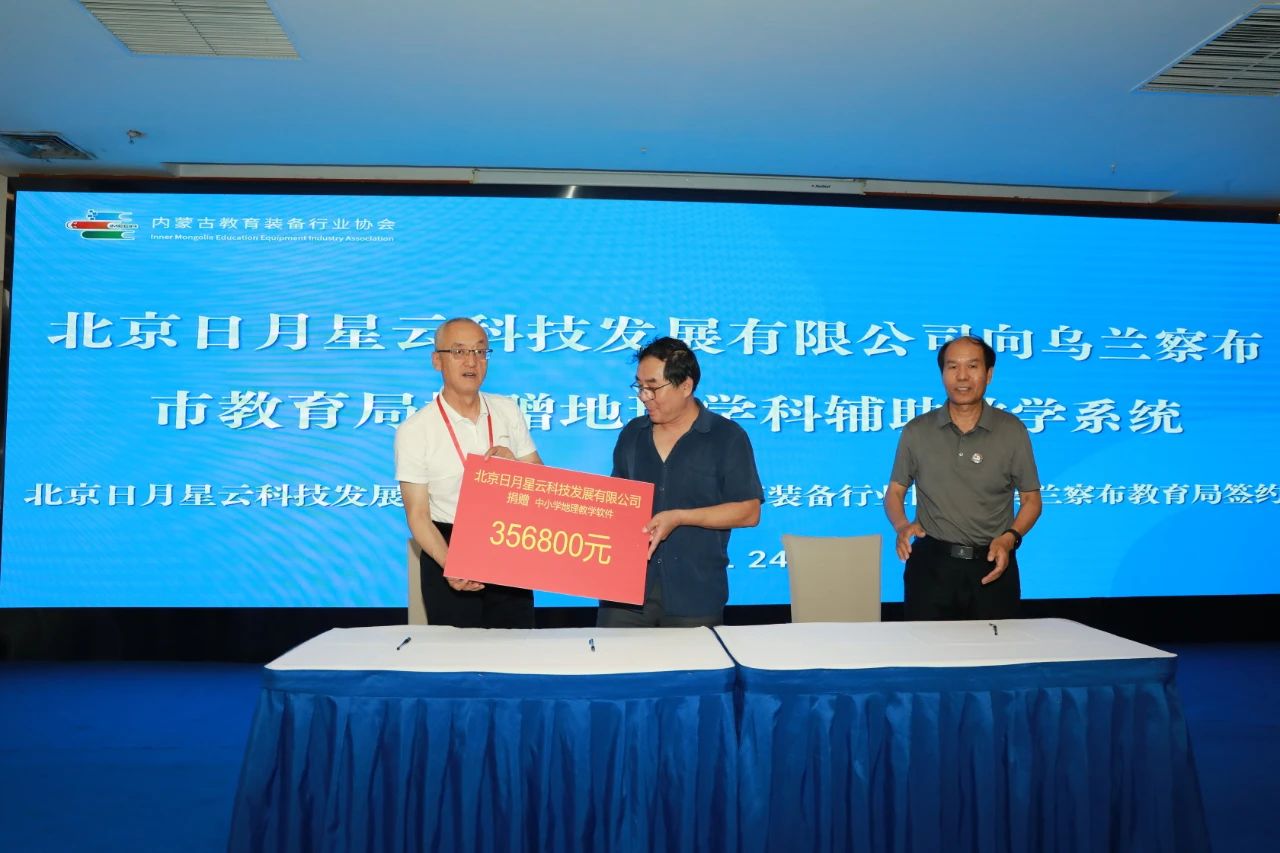 在全場嘉賓的見證下,相關代表鄭重簽署捐贈協議,定格京蒙攜手助力教育發展的重要瞬間。北京教育裝備行業協會和會員企業共計捐贈103.41萬元,其中北京教育裝備行業協會捐款 20 萬元,北京金三惠科技有限公司捐贈音樂教學設備一批24.1萬元,北京中教啟星科技股份有限公司捐贈教學儀器及教學軟件一批23.63萬元,北京日月星云科技發展有限公司捐贈中小學地理教學軟件一批35.68萬元。