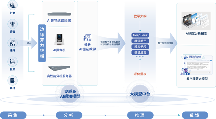 為提升教研活動在課堂優化與教師成長方面的實際效用,奧威亞AI循證教研解決方案依托部署于教室的“具身智能”AI攝像機及多類型感知終端,可對課堂語音、師生行為、板書課件等多模態數據進行無感化、常態化采集。系統搭載了奧威亞AI教育專屬模型,能夠實時生成包含教學綜合分析和循證聽課細節的AI分析報告,為教師提供實時、精準的課堂反饋。教師可結合客觀數據報告與教研員評價,實現“機研”與“人研”的深度對話,助力教學改進有據可依。