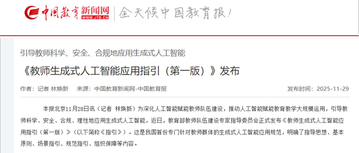 近日,教育部教師隊伍建設專家指導委員會正式發布《教師生成式人工智能應用指引(第一版)》,為引導教師愿用、會用、善用,并且科學、理性地應用生成式人工智能繪制了清晰的“應用地圖”,確立了教師應用生成式人工智能的方向。