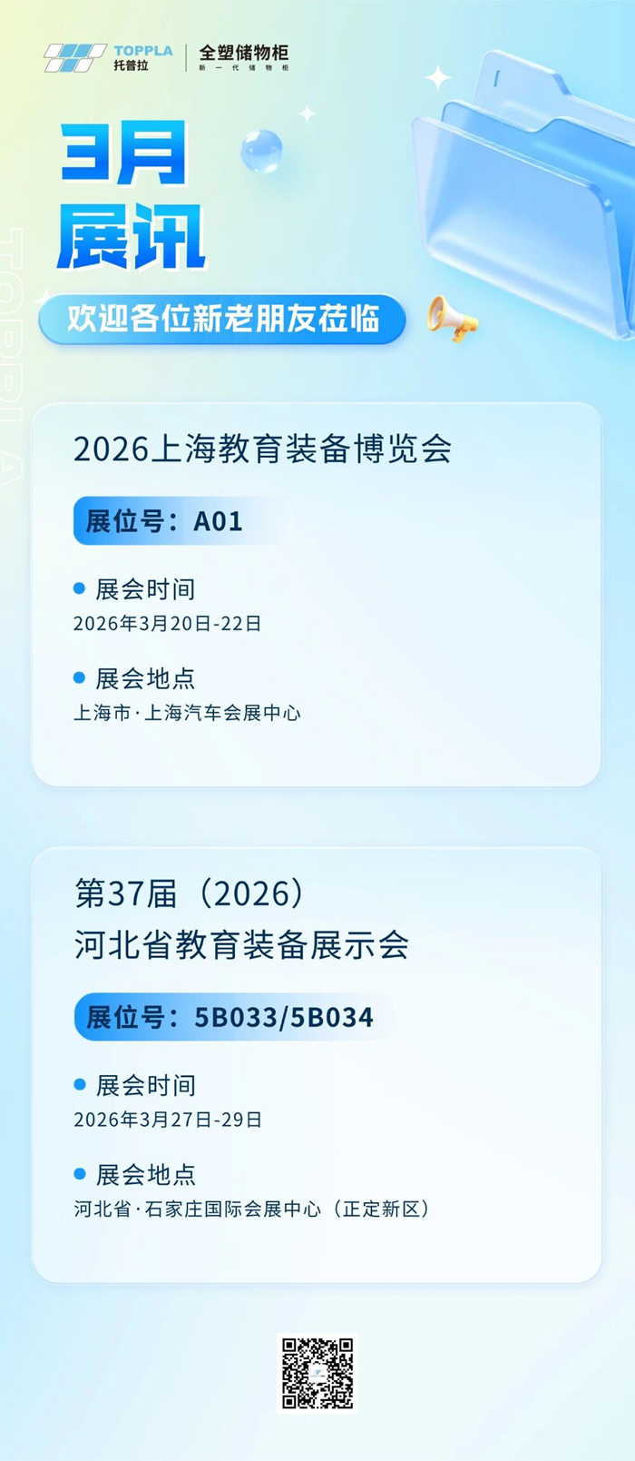 春啟新程,赴約而行。3月,托普拉將以飽滿的熱情、專業的產品、務實的態度,攜全學段校園儲物核心解決方案,靜候各位教育同仁蒞臨展會現場,共赴教育裝備創新之約,共啟校園儲物新未來!