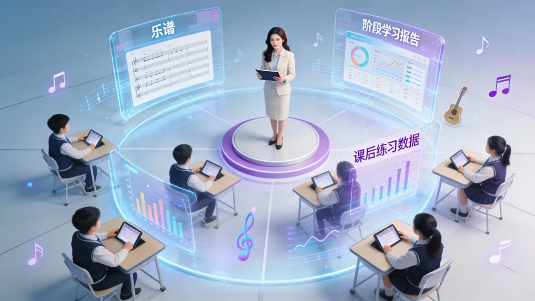 AI音樂課堂以智能音樂教學軟件為核心、AI賦能、數(shù)據(jù)驅(qū)動,是面向中小學的智能互動式音樂課堂解決方案。
