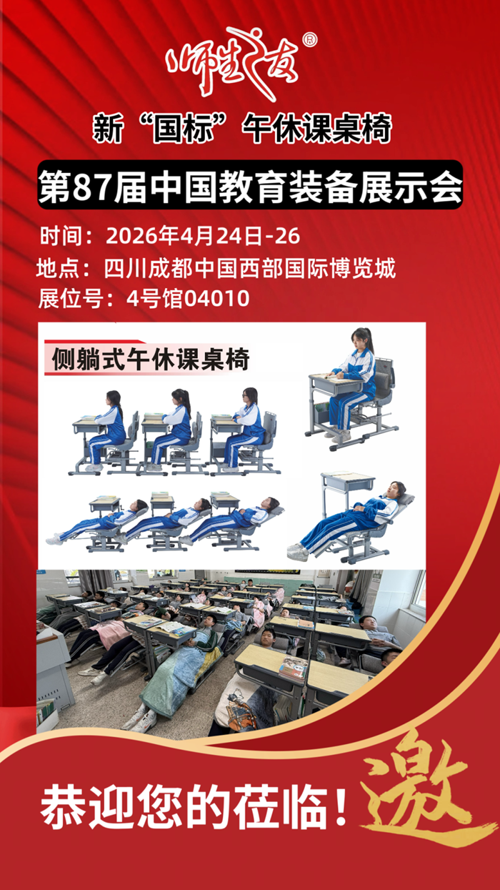 第87屆中國教育裝備展示會即將于2026年4月24日-26日,在四川成都·中國西部國際博覽城盛大啟幕。作為校園午休課桌椅領域的標桿品牌,師生之友攜全系列創新午休課桌椅產品重磅亮相,誠邀全國教育界同仁、學校負責人、教育裝備采購商、行業合作伙伴蒞臨展位,共話校園健康學習新場景,共謀教育裝備發展新機遇!