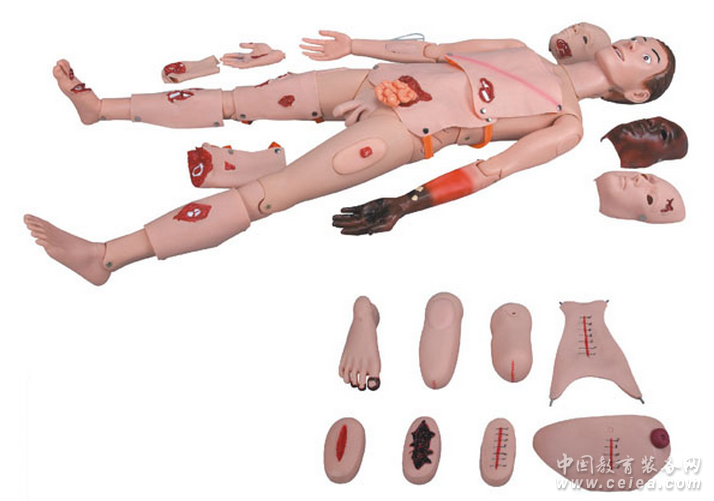 產品詳細介紹產品名稱:高級全功能創傷護理人模型 護理操作教學模型 護理教學模型 護理操作模擬人 該產品是由TR/HL125型的功能基礎上進行升級,除了KAS/122A型的全部功能外,還增加了創傷護理功能。創傷模塊具有模擬出血等功能特點,更增加了現場處理及護理培訓的真實感。 功能特點: 1、 具有TR/HL125型全部功能: • 洗頭、洗臉 • 眼耳清洗、滴藥 • 口鼻氣管插管 • 氣管切開護理 • 吸痰法 • 氧氣吸入法 • 口鼻飼食法 • 洗胃法 • 胸腔解剖重要器官結構 • 手臂靜脈穿刺、注射、輸液(血) • 三角肌皮下注射 • 股外側肌注射 • 胸腔、腹腔、肝臟、骨髓、腰椎穿刺 • 灌腸法 • 女性導尿術 • 男性導尿術 • 女性膀胱沖洗 • 男性膀胱沖洗 • 造瘺引流術 • 臀部肌肉注射 • 整理護理:擦浴、穿換衣褲 2、 增加創傷功能模塊: • 面部燒傷Ⅰ、Ⅱ、Ⅲ度 • 前額撕裂傷口 • 頜骨創傷 • 鎖骨開放性骨折與胸膛挫傷 • 腹部創傷伴有小腸突露 • 右上臂肱骨開放性骨折 • 右手開放性骨折、軟組織撕裂傷口 • 骨組織暴露 • 右手掌槍彈傷口 • 右大腿股骨開放性骨折 • 右大腿復合型股骨骨折 • 右大腿金屬異物刺激 • 右小腿脛骨開放性骨折 • 右足開放性骨折小趾截斷創傷 • 左前臂燒傷Ⅰ、Ⅱ、Ⅲ度 • 左大腿截斷創傷 • 左小腿脛骨閉合性骨折以及踝關節和足挫傷 • 胸壁切開縫合傷口 • 腹壁切開縫合傷口 • 大腿外傷切開縫合傷口 • 大腿感染性潰瘍 • 足壞疽、第1、2、3足趾和足跟壓瘡 • 上臂截肢傷口 • 小腿截肢傷口