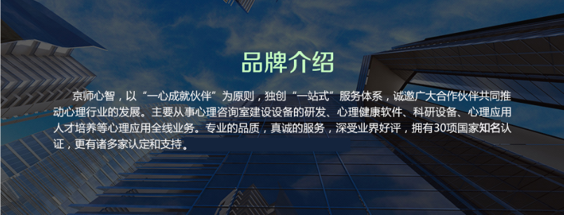 京師心智(北京)科技服務有限公司(簡稱京師心智),以“一心成就伙伴”為原則,幫助心理行業發展為宗旨,主要從事心理健康教育設備的研發與生產、心理圖書的出版,做渠道的心理健康教育設備品牌;
