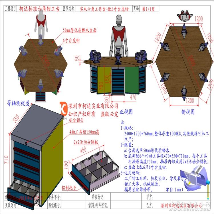 與普通的六角工作臺相比,柯達六角工作臺具有六邊多工位、組裝式結構、帶工具柜臺虎鉗等特點。臺面中間設置有電源氣源接口臺,配備單相220V,三相380V電源插座和氣源接口(各六個)。臺面中間配小臺面每邊邊長550mm;用于連接各類電氣、氣源接頭、開關等電器群。 六角鉗工臺突破傳統鉗工桌不同,它配備有臺虎鉗、銼刀、鉆 鉸刀、磨床等鉗工工具,滿足加工零件、模具裝配、設備維修等各種鉗工作業需要,極大的方便了鉗工的作業和生產.