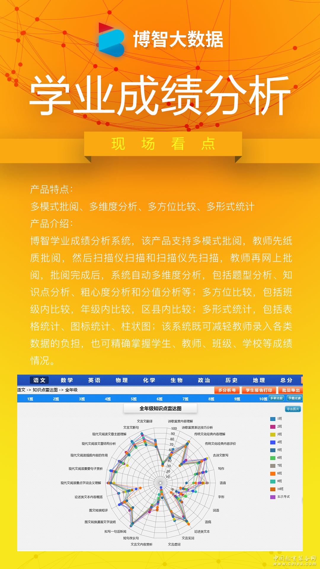 產品詳細介紹博智學業成績分析系統,該產品支持多模式批閱,教師先紙質批閱,然后掃描儀掃描和掃描儀先掃描,教師再網上批閱,批閱完成后,系統自動多維度分析,包括題型分析、知識點分析、粗心度分析和分值分析等;多方位比較,包括班級內比較,年級內比較,區縣內比較;多形式統計,包括表格統計、圖標統計、柱狀圖;該系統既可減輕教師錄入各類數據的負擔,也可精確掌握學生、教師、班級、學校等成績情況。 產品特點:多模式批閱、多維度分析、多方位比較、多形式統計。