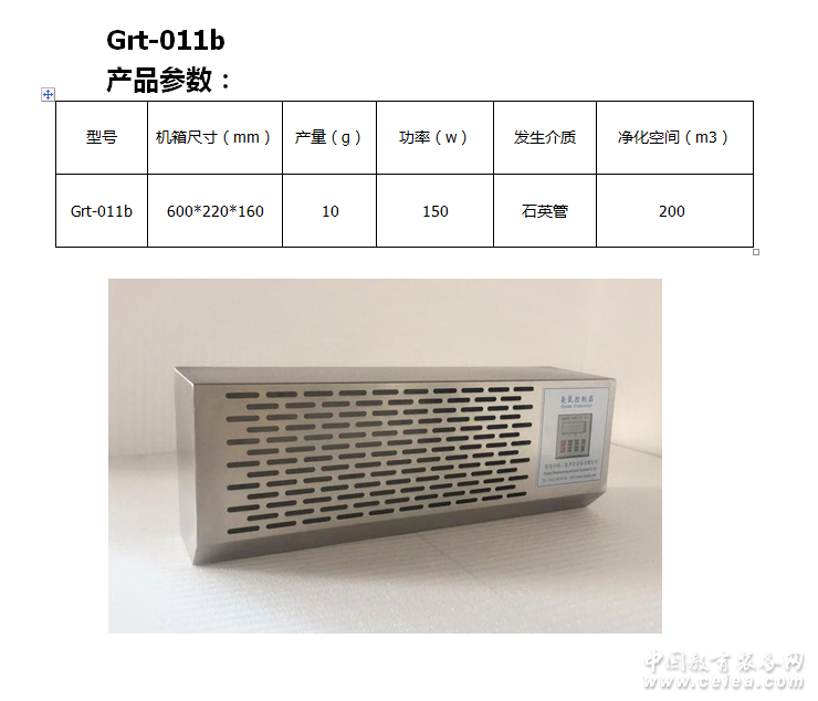 型號 臭氧產(chǎn)量 臭氧濃度 功率 使用電源 機身尺寸(mm) 凈化面積 冷卻方式 氣源 Grt-910s 10g 15-30mg/L 150W 220v/50hz 600*160*220mm 200m3 風(fēng)冷 空氣 |