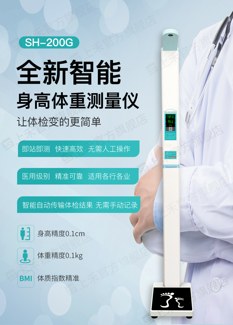 產(chǎn)品詳細(xì)介紹超聲波無接觸測量身高、潔凈、衛(wèi)生,測量速度快,測量精度高 數(shù)據(jù)輸出格式:1,提供RS232接口和WiFi接口,方便用戶接入醫(yī)院系統(tǒng)或遠(yuǎn)程健康系統(tǒng),測量結(jié)果可以發(fā)送到手機(jī),并提供健康建議,方便用戶關(guān)注體重對健康的影響; 2,并提供測量數(shù)據(jù)和微信公眾號的綁定,居民在通過手機(jī)獲取測量數(shù)據(jù)的同時關(guān)注醫(yī)療單位公眾號,方便醫(yī)療單位健康知識的宣傳和衛(wèi)生政策的傳達(dá); 體型:自動計算BMI指數(shù),并判斷BMI指數(shù)范圍; 體重測量方式:精密平衡梁電阻應(yīng)變式壓力傳感器稱重; 身高測量方式:采用高精度超聲波傳感器并實現(xiàn)溫度補(bǔ)償功能; 測高范圍:20-210cm, 鑒定精度:±0.5cm 分度值:0.5cm或0.1cm可調(diào); 稱重范圍:2.0-500KG,鑒定精度:±0.1kg 分度值:0.1kg或0.01kg可調(diào); 測重傳感器:高精度度、高靈敏、高性能精密平衡梁式壓力傳感器; BMI測量:正常范圍19-25 自動計算BMI數(shù)值,BMI范圍可以根據(jù)需求進(jìn)行調(diào)整; 方便移動:整機(jī)高度:230CM 折疊后:120CM 機(jī)身可折疊,用料精致,攜帶方便; LCD顯示:采用7寸高清彩色液晶屏,超大字體,醒目清晰顯示,日期時間溫度,與網(wǎng)絡(luò)同步,時間準(zhǔn)確,顯示體型體型偏胖、正常、偏瘦; 自動語音播報:清晰語音報出測量數(shù)值并且客戶可以根據(jù)使用情況設(shè)置提示語音例如:歡迎光臨 輸出:提供RS232接口和WiFi接口,可根據(jù)客戶需求選配無線藍(lán)牙2.0/4.0,4G模塊,RJ45網(wǎng)口云接口等,方便用戶接入醫(yī)院系統(tǒng)或遠(yuǎn)程健康系統(tǒng),測量結(jié)果可以發(fā)送到手機(jī),并提供健康建議,方便用戶關(guān)注體重對健康的影響 數(shù)據(jù)存儲:可存儲100萬條以上數(shù)據(jù),并支持U盤導(dǎo)出; 測量速度:快速精準(zhǔn)測量600次/小時; 多媒體廣告屏:采用7寸彩色高清液晶屏及安卓4.4以上操作系統(tǒng),液晶屏上可以設(shè)置顯示使用單位名稱,例如:某某衛(wèi)計委祝您健康。自動循環(huán)播放視頻音頻及圖片宣傳健康知識或衛(wèi)生醫(yī)療政策,使用單位可以自己更換宣傳片,非常方便; 電源:采用AC100V-240V/12V直流電源,輸入寬電壓適合電壓不穩(wěn)定地區(qū); 消耗功率:待機(jī)10W,工作時平均15W; 工作環(huán)境:溫度-10℃至+40℃ 濕度:20%-85%PH; 推薦使用:醫(yī)院、疾控中心、學(xué)校、藥房、商場/超市、公安系統(tǒng)、健身房等部門單位 可選配、可定制,支持連鎖機(jī)構(gòu)、健康一體機(jī)配套方案等; |