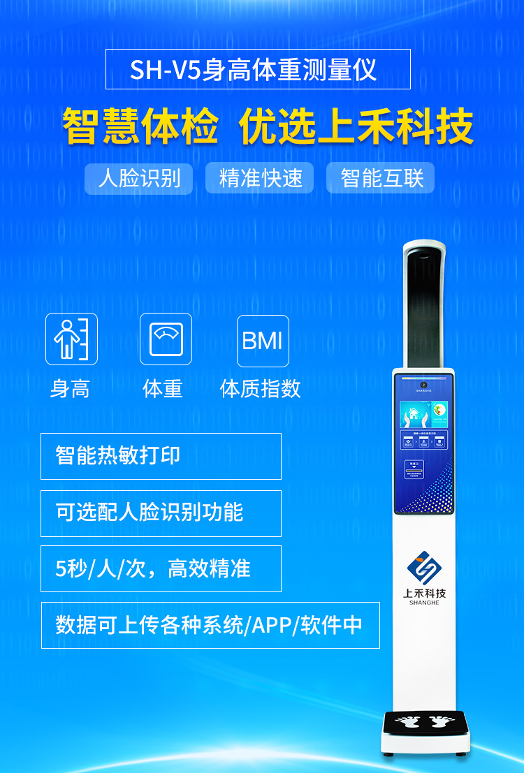 產(chǎn)品詳細介紹超聲波無接觸測量身高、潔凈、衛(wèi)生,測量速度快,測量精度高 操作系統(tǒng):采用專業(yè)為健康體檢深度定制安卓4.4智能最新OS操作系統(tǒng),可選擇單項測量,全部順序測量等模式,全程智能語音和動畫提示操作簡單, 通訊方式:提供RS232接口和WiFi接口,藍牙(選配),3G/4G(選配)RJ45網(wǎng)口(選配)。 可與第三方系統(tǒng)數(shù)據(jù)通信;兼容與醫(yī)院、電子病例(EMR)、HIS健康體檢系統(tǒng)數(shù)據(jù)共享通信; 體重測量方式:高精度、高靈敏、高性能精密平衡梁電阻應(yīng)變式壓力傳感器稱重身高測量方式:采用美國進口SensComp超聲波傳感器并實現(xiàn)溫度補償功能, 身高測量:20-210cm, 鑒定精度:±0.5cm 分度值:0.5cm或0.1cm可調(diào) 體重測量:2.0-500KG,鑒定精度:±0.1kg 分度值:0.1kg或0.01kg可調(diào) BMI體型:采用最新WHO標準或者中國九城市標準(客戶可根據(jù)自己需求進行調(diào)成)自動計算 *LCD顯示:采用10.2寸高清彩色液晶屏,超大字體,醒目清晰顯示,日期時間溫度,與網(wǎng)絡(luò)同步,時間準確,顯示體型體型偏胖、正常、偏瘦。 打印功能:采用高速熱敏易裝打印機實現(xiàn)自動打印自動切紙,換紙方便,打印身高體重BMI,理想體重和體重正常范圍等多種信息,還可設(shè)置打印醫(yī)療衛(wèi)生單位名稱, 例如:某某疾病預(yù)防控制中心某某社區(qū)。 自動語音播報:清晰語音報出測量數(shù)值并且客戶可以根據(jù)使用情況設(shè)置提示語音 微信推廣:設(shè)備并提供測量數(shù)據(jù)和微信公眾號的綁定,居民在通過微信掃一掃手機獲取測量數(shù)據(jù)的同時關(guān)注醫(yī)療單位公眾號,并提供健康建議,生成健康曲線方便用戶關(guān)注體重對健康的影響,方便醫(yī)療單位健康知識的宣傳和衛(wèi)生政策的傳達。 數(shù)據(jù)存儲:可存儲100萬條以上測量數(shù)據(jù),并支持U盤導(dǎo)出, 多媒體廣告屏:采用10.2寸彩色高清液晶屏觸摸大屏,液晶屏上可以設(shè)置顯示使用單位名稱, 例如:某某疾病預(yù)防控制中心某某社區(qū)。自動循環(huán)播放視頻音頻及圖片宣傳健康知識或衛(wèi)生醫(yī)療政策,使用單位可以自己更換宣傳片,非常方便。 電源電壓:采用AC100V-240V/12V直流電源,輸入寬電壓適合電壓不穩(wěn)定地區(qū) 消耗功率:待機15W,工作時平均25W 工作環(huán)境:溫度-10℃至+40℃ 濕度:20%-85%PH; 推薦使用:醫(yī)院、社區(qū)服務(wù)站、疾控中心、體檢中心、養(yǎng)老中心,企事業(yè)單位等部門和單位;