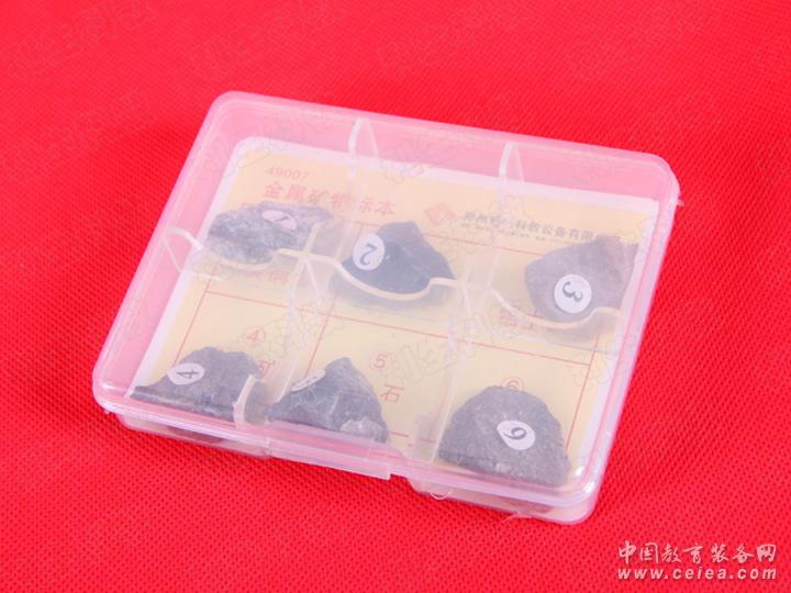 黃銅礦、磁鐵礦、鋁土礦、白鎢礦、錫石、鉬石6種組成。每個(gè)標(biāo)本有相對(duì)應(yīng)的標(biāo)識(shí),正確清晰,依次固定在透明塑料盒中。