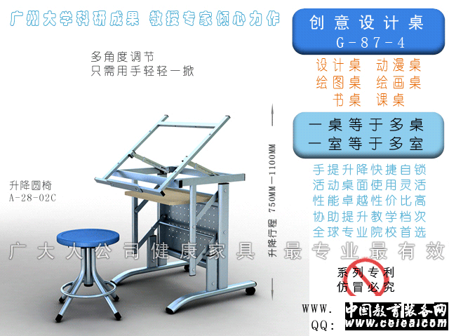 創(chuàng)意設(shè)計(jì)桌 多功能升降,一桌等于多桌: 普通書(shū)桌、繪畫(huà),設(shè)計(jì)桌,一間課室等于多間課室。 ·作普通書(shū)桌:可微調(diào)高度角度,預(yù)防近視、腰椎病和頸椎病。 ·特殊書(shū)桌:可站立學(xué)習(xí)和工作,回復(fù)人體脊椎和呼吸的自然狀態(tài),預(yù)防肥胖和痔瘡。 ·作繪畫(huà)桌、設(shè)計(jì)桌:可調(diào)任意角度,可調(diào)節(jié)多個(gè)高度,可疊加大圖板;無(wú)需電源,價(jià)格低廉。 CREATIVITY TABLE Multifunctional movement,One desk has more functions: common desk, rawing table,designingtable. One