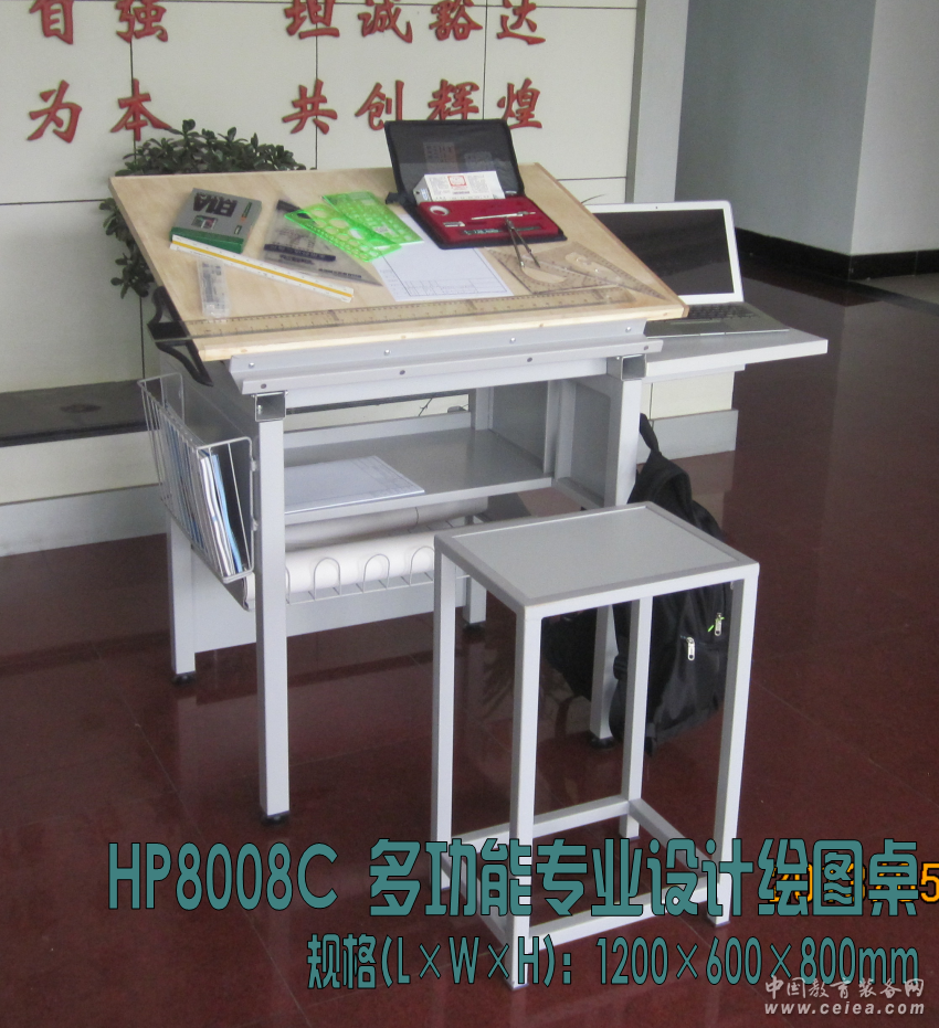 產(chǎn)品詳細介紹規(guī)格(L×W×H):1200×600×800mm (標配三聚氰胺桌面) 結(jié)構(gòu)技術(shù)參數(shù): 整體采用全鋼結(jié)構(gòu),標配主桌面采用厚度2.5cm的80×60cmE1環(huán)保楓木色三聚氰胺板桌面基板; 下雙側(cè)采用“惠普”繪圖專用傾角調(diào)節(jié)鉸鏈,經(jīng)久耐用,保證桌面平整、同步控制調(diào)節(jié)傾斜度調(diào)節(jié)0-80°;桌面板下端筆槽邊高出桌面折邊可擋住1、2號繪圖板或者丁字尺等物品; 桌子右邊采用“惠普”專利折疊結(jié)構(gòu)的副桌面板(E1國標的25mm三聚氰胺板400×550mm),滿足教學(xué)和繪圖作業(yè)配套放置電腦、文具、書籍等需求;不使用時可以下掛節(jié)省空間; 桌體右邊設(shè)置有掛鉤,可以掛放書包等物品; 桌體左邊為儲物鋼制書籍婁,可放置書籍、文具等; 主桌面下面和支架中部配置有二處鋼制儲物廂,可以放置書包、文具等; 下部為放置繪圖紙的圖紙的鋼婁; 桌體背部設(shè)置有放置1號或者2號繪圖板的機構(gòu),方便存放繪圖板; 桌腿支架底部采用塑膠木調(diào)整螺絲,便于調(diào)節(jié)水平等功能,保證整體結(jié)構(gòu)的堅固、穩(wěn)定; 整體設(shè)計科學(xué)、合理、實用和耐用,適合于工程制圖繪圖和繪畫專業(yè)的多種學(xué)科,在院校內(nèi)實用和功能齊全的一款多功能繪圖桌,有較強的多種行業(yè)和課程的兼容性和普及性。 |