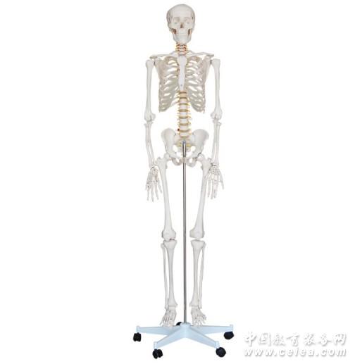 這款經濟型的、真人大小的、關節相連的塑料模型是基礎解剖教學的理想模型,物美價廉。手臂和腿部可拆下供研究。顯示神經分支、脊椎動脈和腰椎間盤等。頭顱含可活動的下巴、可移動的頭顱蓋、骨縫線。能夠非常直觀立體的展示人體全身骨骼結構,讓學生們有興趣學習骨頭的名稱,使學生、醫生和其他對人體骨骼模型感興趣者感到滿意。 人體骨骼模型的構造: (一)頭顱骨:由22塊頭骨組成整顱,顱蓋橫切,取去后示顱內諸結構,下頜骨可以活動。 (二)脊柱:由七個頸椎,十二個胸椎,五個腰椎,一塊骶骨,一塊尾骨及廿三個椎間軟骨組成。并示頸、胸、腰、骶四個生理彎曲。 (三)胸廓:由24塊肋骨、一塊胸骨,肋軟骨與脊椎胸椎部分連接,構成胸廓。 (四)骨盆:由骶骨、尾骨和兩塊髖骨組成。 (五)上肢骨:由64塊骨組成,肩帶部分的肩胛骨和鎖骨固定在胸廓上,上肢的游離都可拆卸,肩、肘、腕等關節均可自由活動。 (六)下肢骨:由62塊骨組成,下肢帶固定構成骨盆,下肢游離都可以拆卸,髖、膝等關節均可自由活動。 人體骨骼模型安放在牢固的16英寸金屬架上。用PVC制成,可水洗,不破碎,附防塵罩 尺寸: 170CM。 包裝: 100x46x28CM, 1件/箱, 13KG