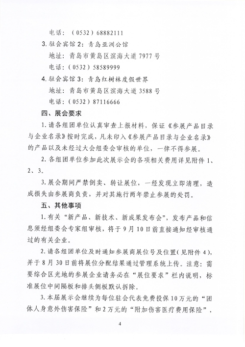 3.報到流程:各參展商到青島西海岸威斯汀酒店聯絡員處報到,領取發票和資料領取卡之后,前往青島世博城國際展覽中心參展商報到登錄處,憑資料領取卡領取會議資料、證件。