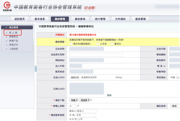 為積極響應商務部關于創新展會服務模式,培育展覽業發展新動能的號召,經第78屆中國教育裝備展示會組委會研究決定,本屆展示會按照既定計劃繼續舉辦線下實體展,同時將充分利用人工智能、云計算、大數據等技術,搭建一場永不落幕的“線上展”。為做好本屆展示會“線上展”數據填報工作,現將填寫要求說明如下:
