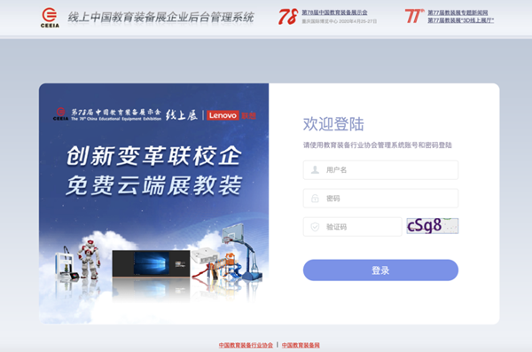 登錄“中國教育裝備行業協會管理系統”(zh.ceiea.com),進入“展會管理”欄目,點擊左側功能菜單“線上展”,系統將自動跳轉至“線上中國教育裝備展企業后臺管理系統”;也可以直接登錄“線上中國教育裝備展企業后臺管理系統”(https://www.ceepsp.com/Subadmin),用戶名及密碼為行業協會管理系統的賬號及密碼。“線上中國教育裝備展企業后臺管理系統”基于chrome瀏覽器開發,建議使用chrome瀏覽器瀏覽本站,其他瀏覽器可能存在不兼容現象。