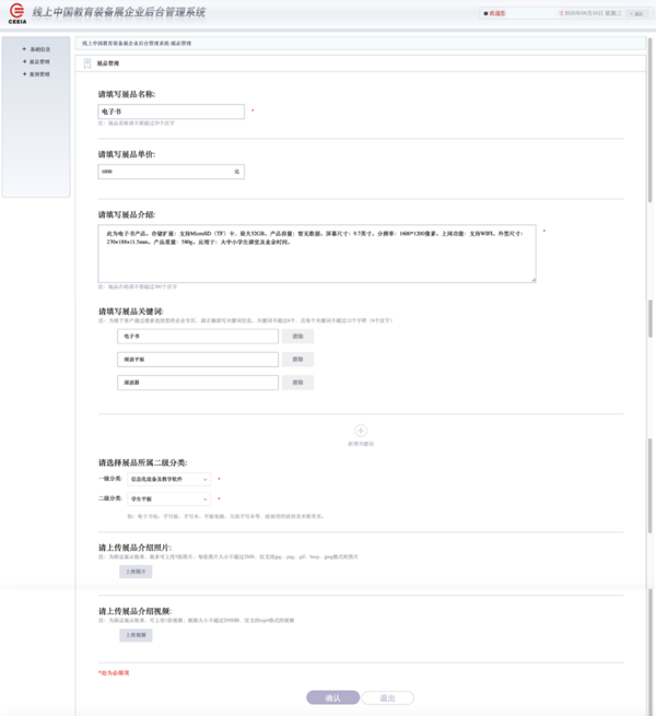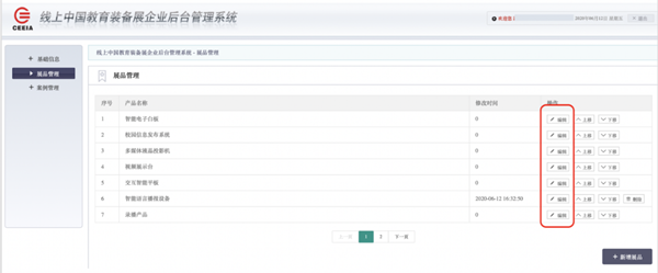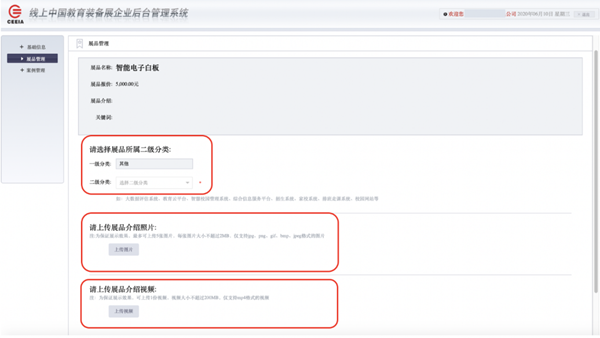 2.新增參展產品:本屆展示會參展企業,除上報參展產品外,還可在本系統中新增產品的信息和數據。在【展品管理】頁,點擊【新增展品】,按要求填寫相應內容。新增的產品只在“線上展”展示,不收錄到《第78屆中國教育裝備展示會參展產品名錄》。