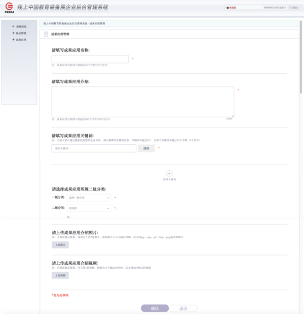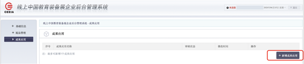 本系統可發布企業成果應用,每個企業最多可發布3項。在【成果應用】頁,點擊【成果應用】,按要求填寫相應內容。