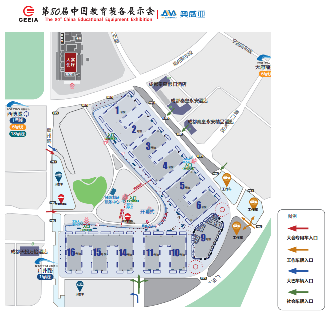 2、所有參加第八十屆教裝展布撤展貨運車輛均按照此外圍交通路線行駛,必須遵守現場交通管理,并聽從交警及現場協管人員的安排。現場工作人員結合館內裝卸實際情況,合理安排車輛辦證放行工作。